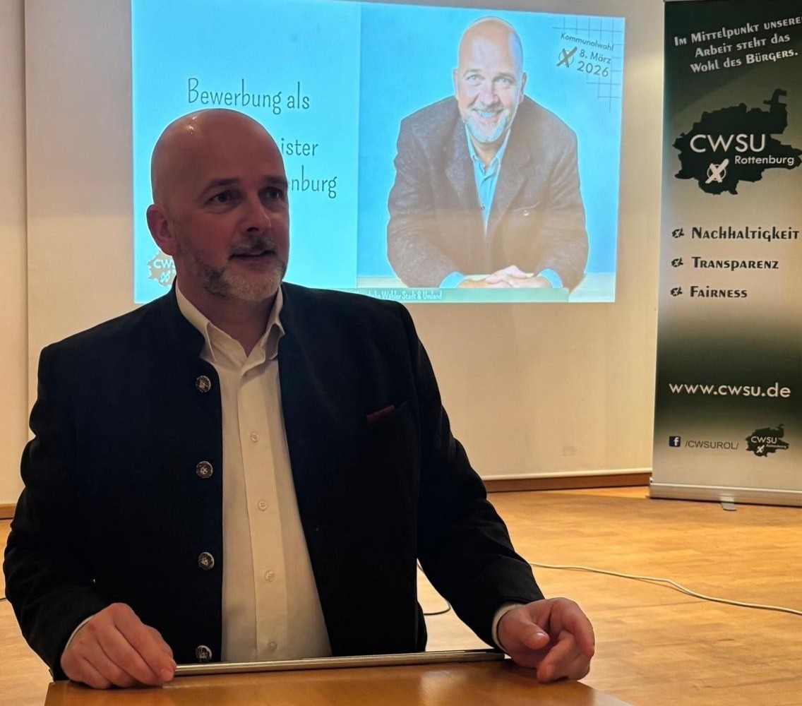 Ein Bürgermeister sei nur so stark wie sein Stadtrat. Deshalb setze er auf offenen Austausch, klare Ziele und parteiübergreifende Zusammenarbeit. Rottenburg sei wichtiger als Parteifarben. Als Kandidat der CWSU trete er parteilos im Denken, aber klar in der Sache an. Er wolle zuhören, erreichbar sein und gemeinsam mit Verwaltung, Stadtrat, Wirtschaft, Vereinen und der Bürgerschaft an einem Strang ziehen.