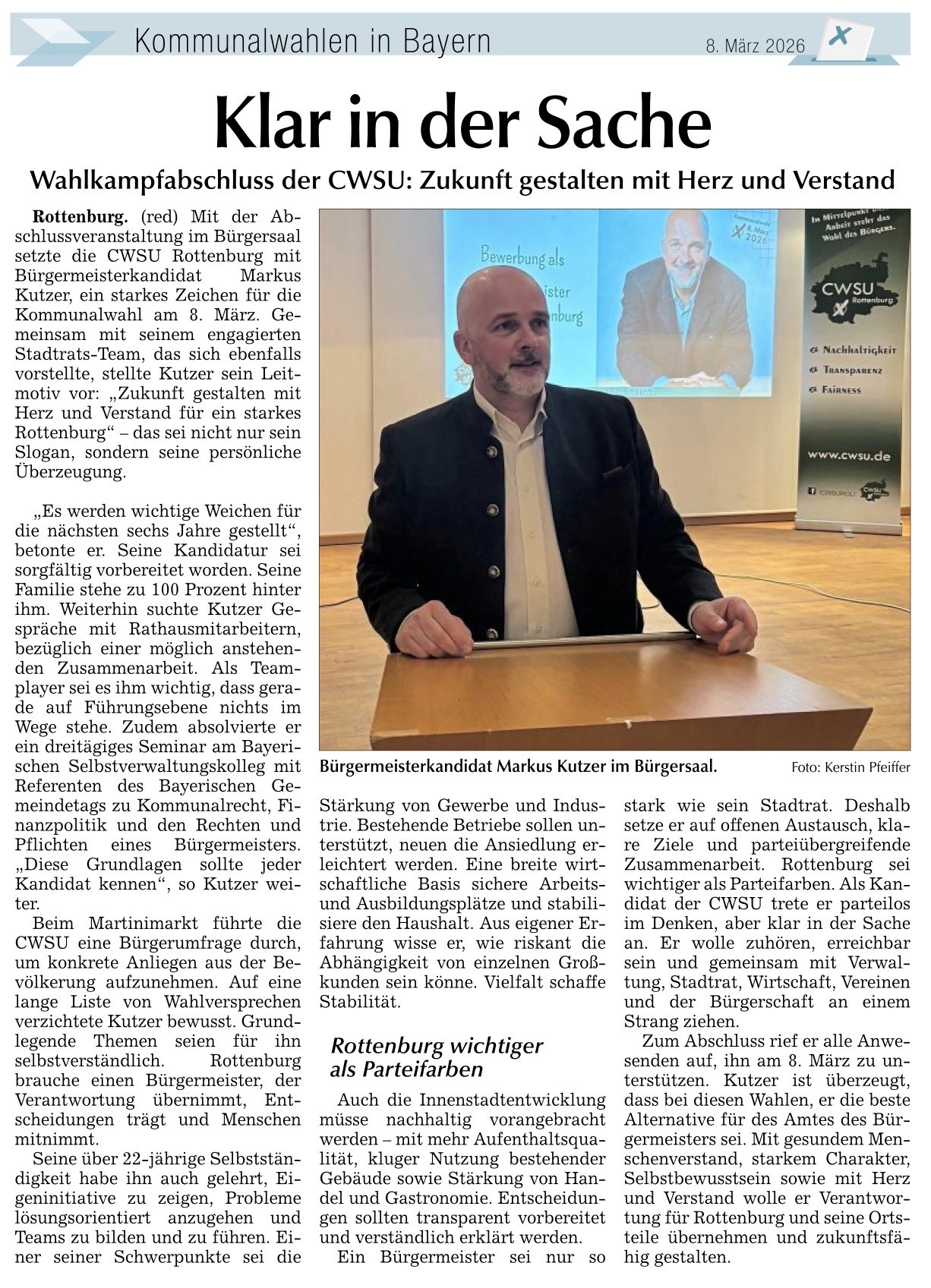 Rottenburg. Die CWSU hat bei ihrer Nominierungsveranstaltung im Rottenburger Bürgersaal ihren Bürgermeisterkandidaten für die Kommunalwahl am 8. März 2026 gewählt. In geheimer Abstimmung wurde Markus Kutzer einstimmig zum Bürgermeisterkandidaten der CWSU nominiert.